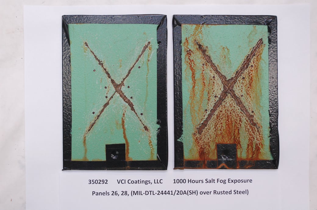 coating failure observed at the “X” scribed areas on both the rusted and white metal substrates. The MIL-DTL-24441 primer with VCI agent provided better resistance to corrosion than